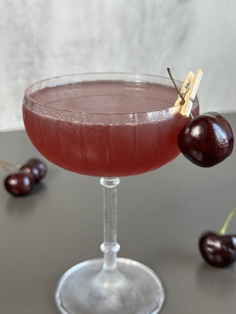 Strain into a martini glass and garnish with premium cherries and lemon zest.