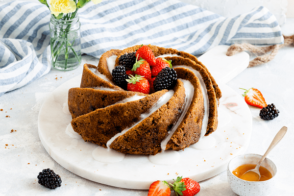 After baking at 350°F for about 50 minutes, I drizzle it with a glaze of powdered sugar and orange juice.