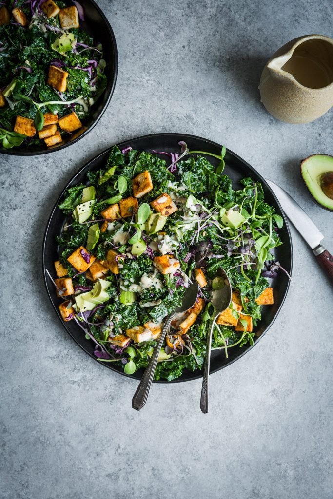 I love pressing extra-firm tofu, marinating it, and pan-searing until golden. Tossed with massaged kale, crunchy nuts, and a tangy tahini dressing, this salad isn’t only high in protein but also incredibly satisfying and versatile! The combination of antioxidants from kale and sprouts enhances the health benefits of this dish.