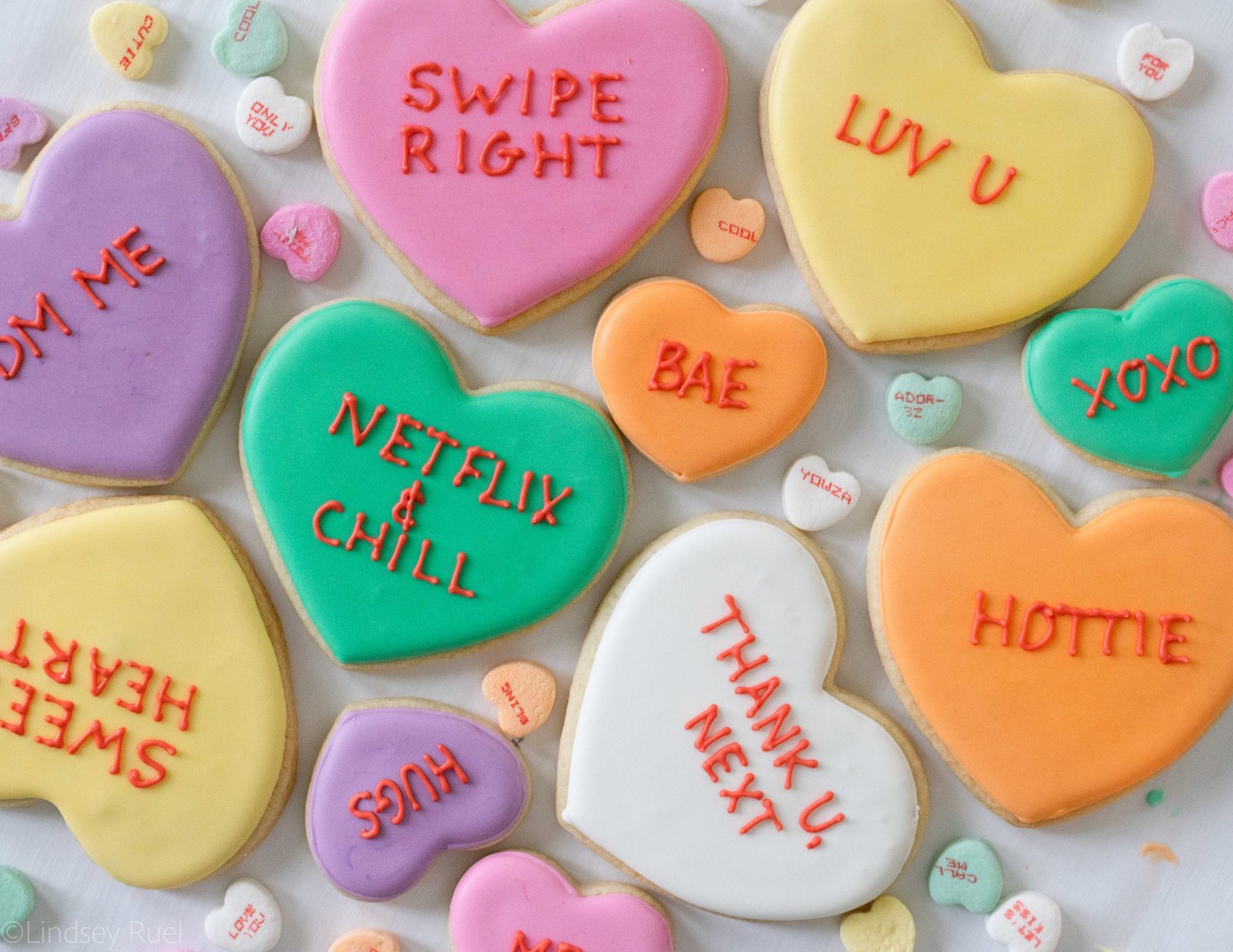 I love using heart-shaped sugar cookies and royal icing in vibrant colors. Writing personalized messages like “Swipe Right” or “DM me” adds a fun twist. Conversation Hearts are iconic Valentine’s Day candy that can be transformed into delicious cookies.