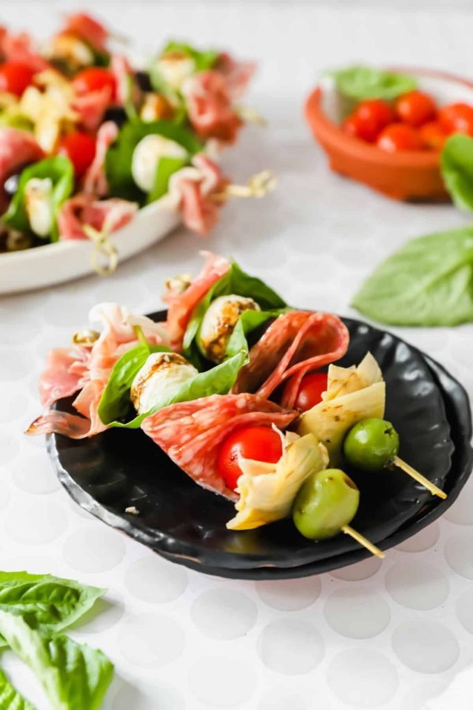 I love assembling skewers with prosciutto, fresh mozzarella, and marinated artichoke hearts.