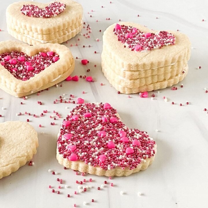 Linzer heart cookies are a delightful treat that perfectly captures the spirit of Valentine’s Day. I love using almond flour for a light texture, mixing it with all-purpose flour, butter, and sugar. After chilling the dough, I roll it out and cut heart shapes. These cookies are traditionally characterized by a crumbly texture filled with raspberry jam, dust with powdered sugar, and assemble them for a sweet, romantic touch!