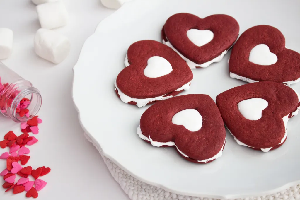I often find that red velvet sandwich cookies are the perfect treat for Valentine’s Day. To make them, I combine all-purpose flour, cocoa powder, and sugar with butter and eggs, adding red food coloring for that signature hue. After baking, I fill them with a luscious cream cheese frosting. They’re not just delicious; they look stunning too, especially with heart-shaped decorations! Their soft and chewy texture makes them a crowd favorite, enhancing any dessert table.